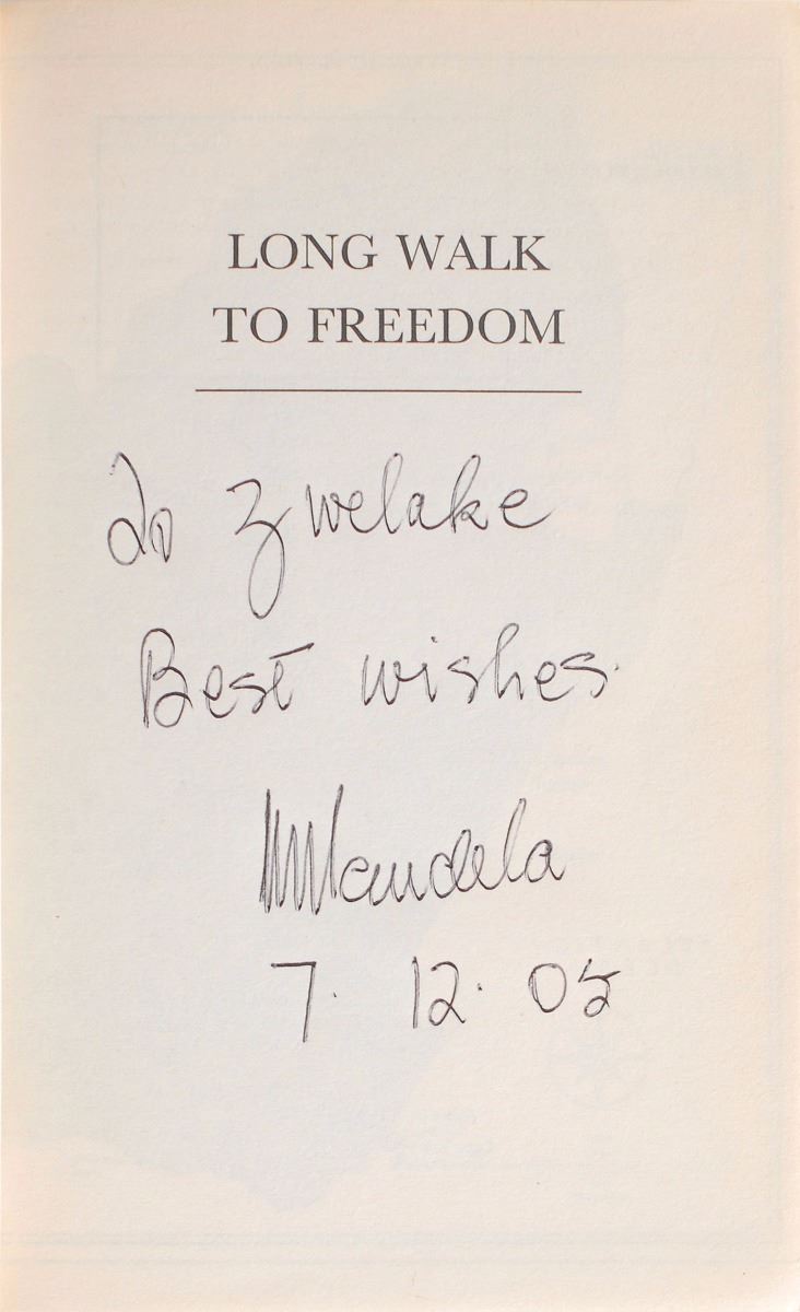 Signed book: Long Walk to Freedom. London: Abacus. Paperback, 5 x 7.75, 768 pages. Signed and inscribed on the title page in black ballpoint, “To Zwelake, Best wishes, N. Mandela, 7.12.02.” In fine condition. Accompanied by a full letter of authenticity from PSA/DNA.
