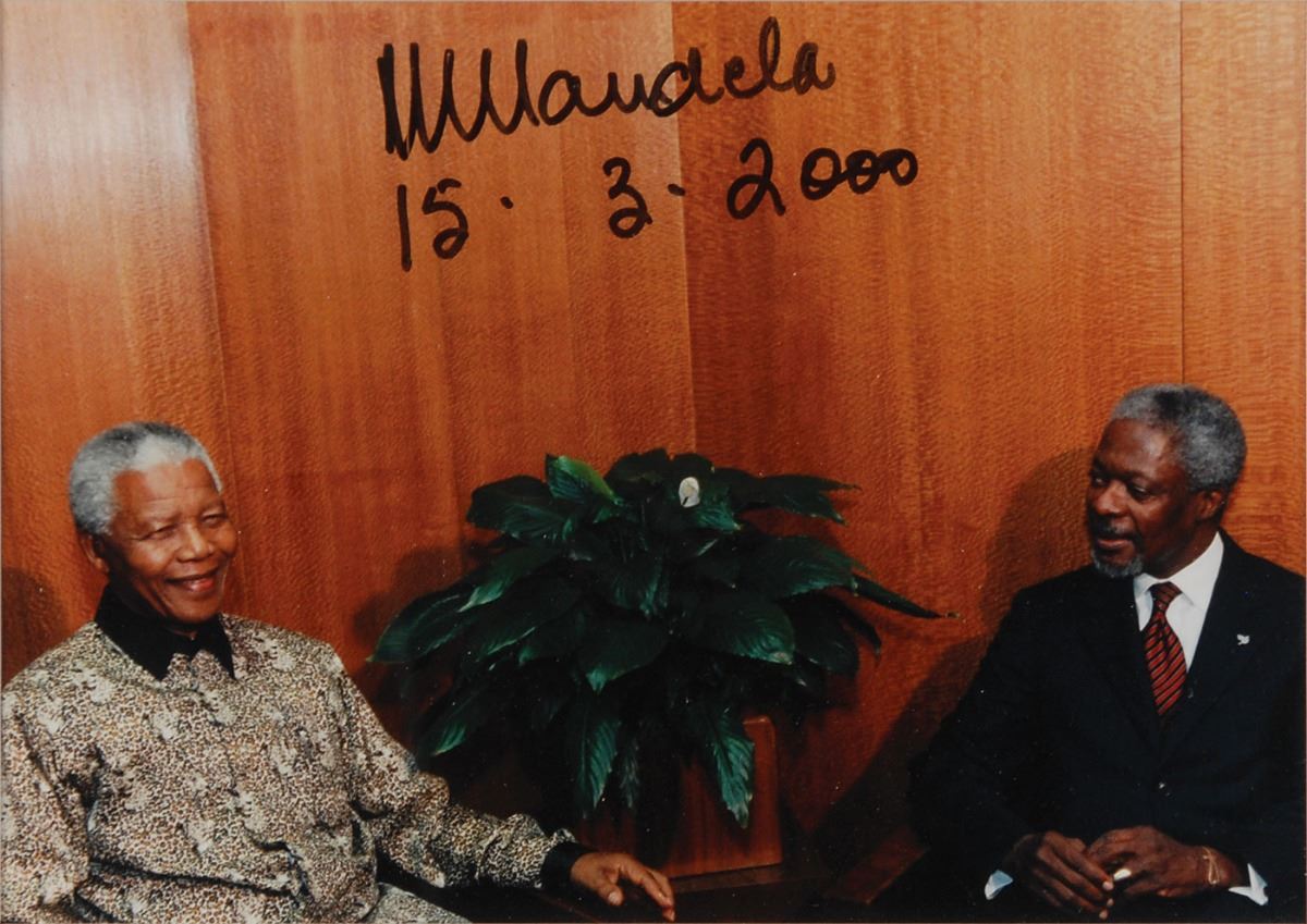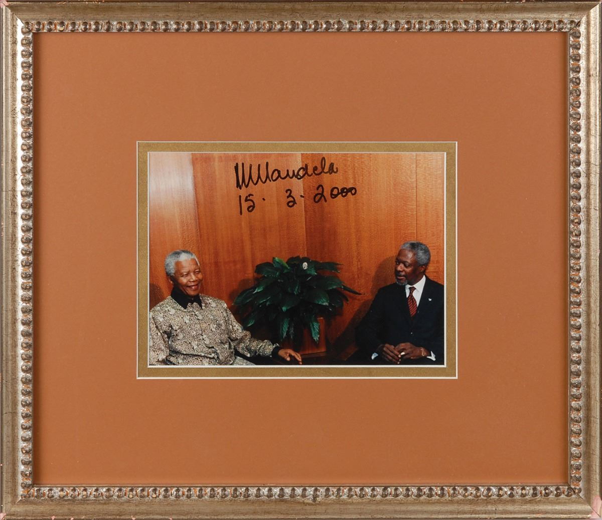 Color glossy 7 x 5 photo of Mandela seated with Kofi Annan, signed in black felt tip, “N. Mandela, 15.3.2000.” Double-matted and framed to an overall size of 14.25 x 12.25. In fine condition. Accompanied by full letters of authenticity from JSA and PSA/DNA.