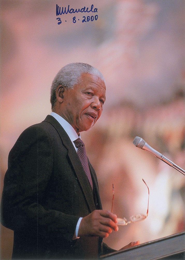 Choice color glossy 8.25 x 11.5 half-length photo of Mandela delivering a speech, signed in blue felt tip, "N. Mandela, 3.8.2000." In very fine condition.