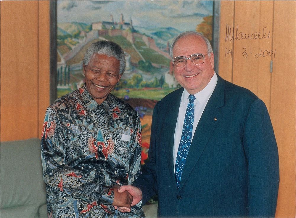 Color glossy 9.5 x 7 half-length photo of Mandela shaking hands with German Chancellor Helmut Kohl during Mandela's trip to Germany in late May 1996, signed in black ballpoint, "N. Mandela, 14.3.2001." Reverse bears official text and Federal Government copyright label. In fine condition.