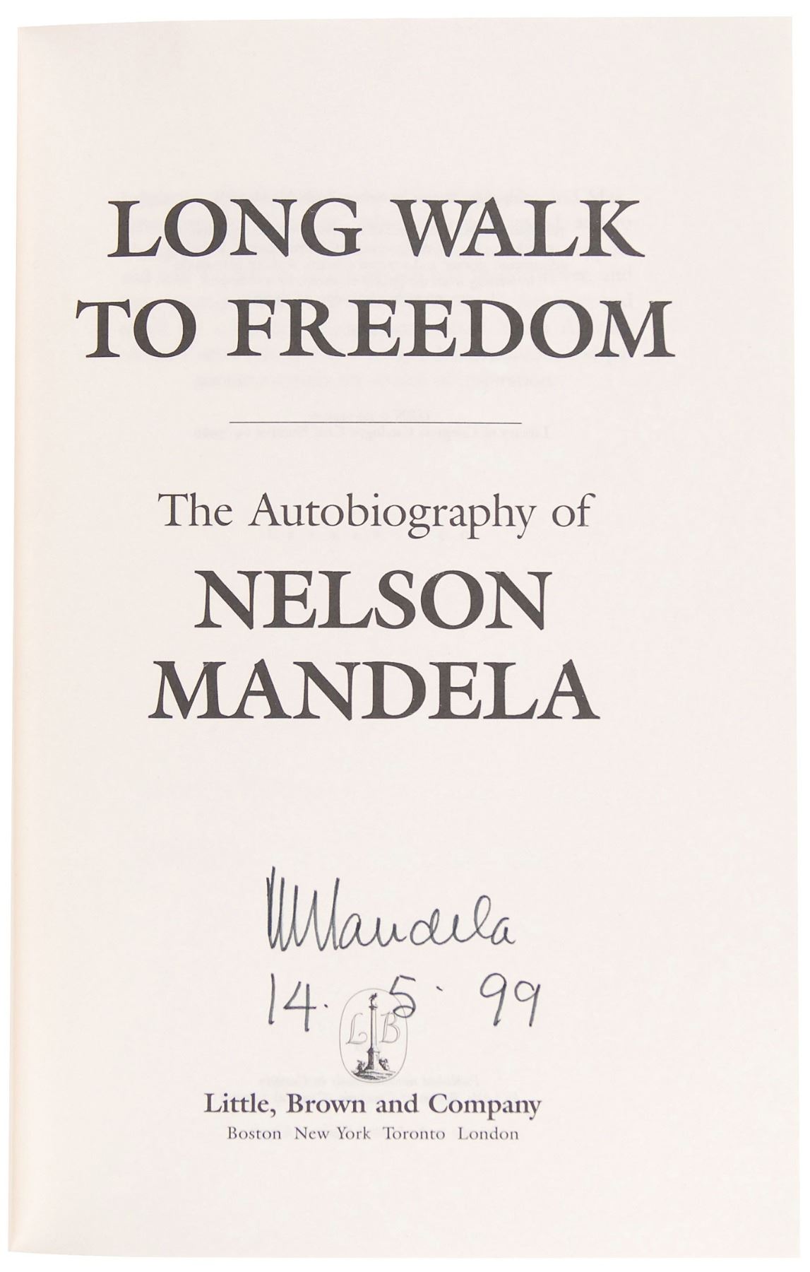 Signed book: Long Walk to Freedom. First edition, first printing. Boston: Little, Brown and Company, 1994. Hardcover with dust jacket, 6.5 x 9.5, 558 pages. Signed on the title page in black felt tip, "N. Mandela, 14.5.99." In fine condition. Accompanied by a May 19, 1999, letter from Mandela's administrative secretary which reads, in part: "Your book 'Long Walk to Freedom' has been autographed by the President as you requested."
