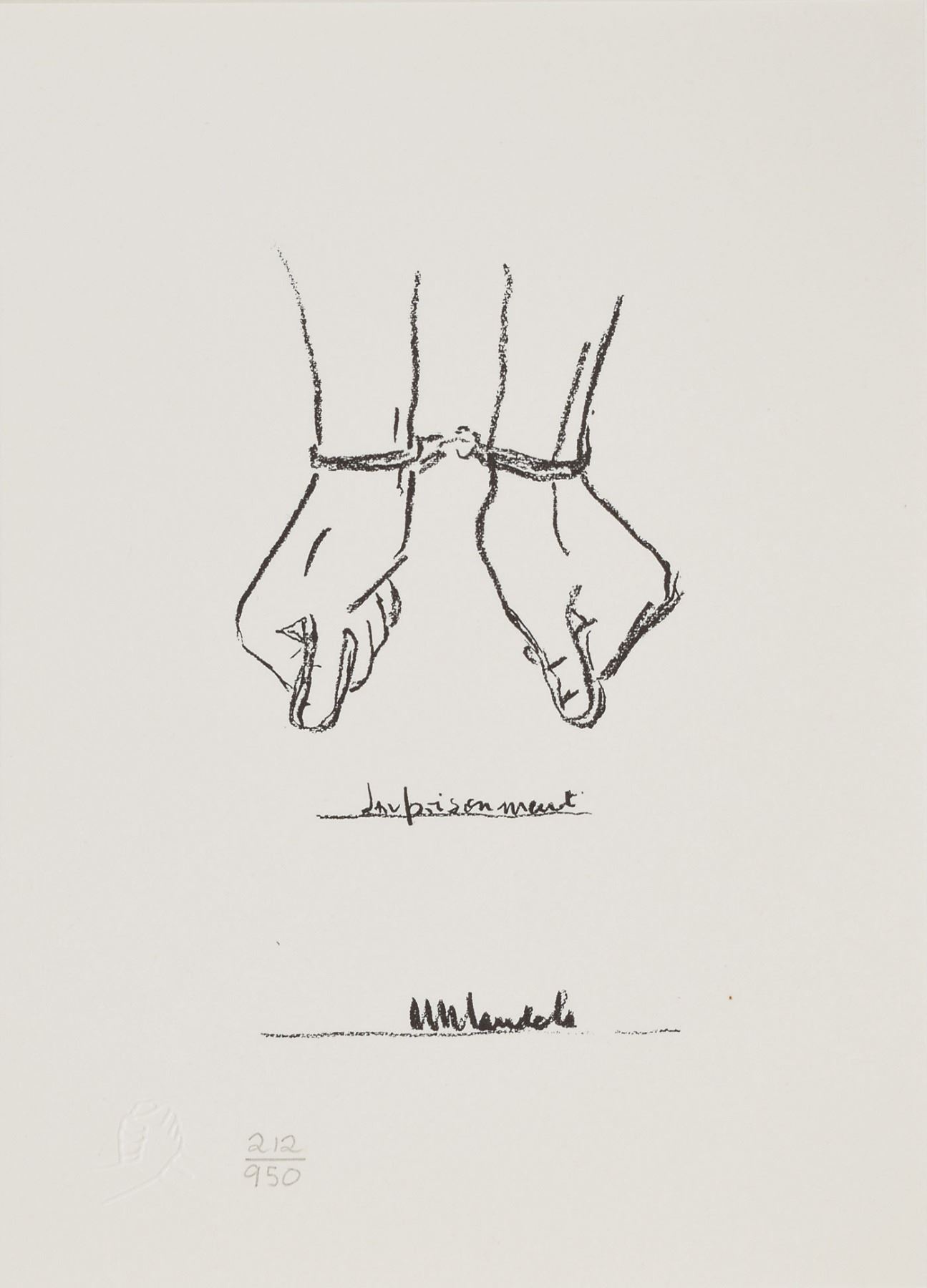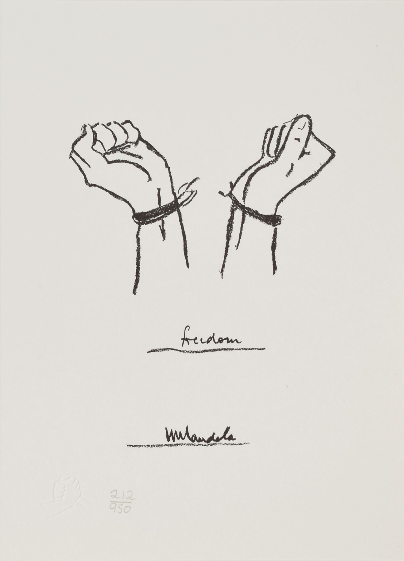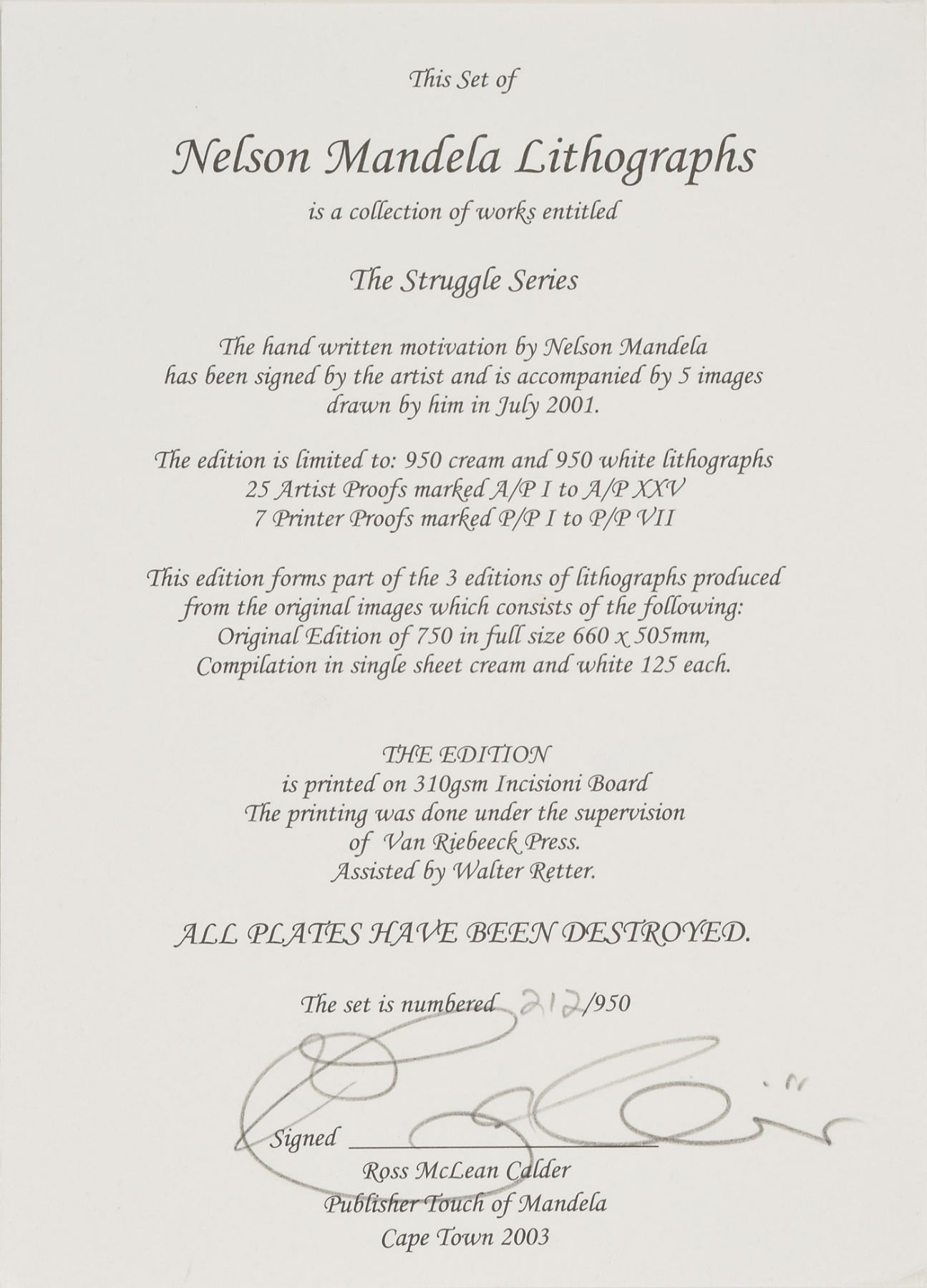 Beautiful limited edition set of six small-format lithographs entitled ‘The Struggle Series,’ numbered 212/950, each measuring 5.75 x 8.25, signed on the first lithograph in pencil, “N. Mandela.” The signed print reproduces Mandela’s handwritten description of the series, and the other prints are of sketches done by Mandela that chronicle his people's struggle; all six also feature Mandela’s facsimile signature inherent to the print. The sketches are entitled ‘Struggle,’ ‘Imprisonment,’ ‘Freedom,’ ‘Unity,’ and ‘Future.’ Mandela explains: ‘These sketches are not so much about my life as they are about my own country.’ In very fine condition. Accompanied by the publisher’s certificate of authenticity and the original handsome black embossed box. An absolutely stunning, scarce set signed by one of the great activist leaders of the 20th century.