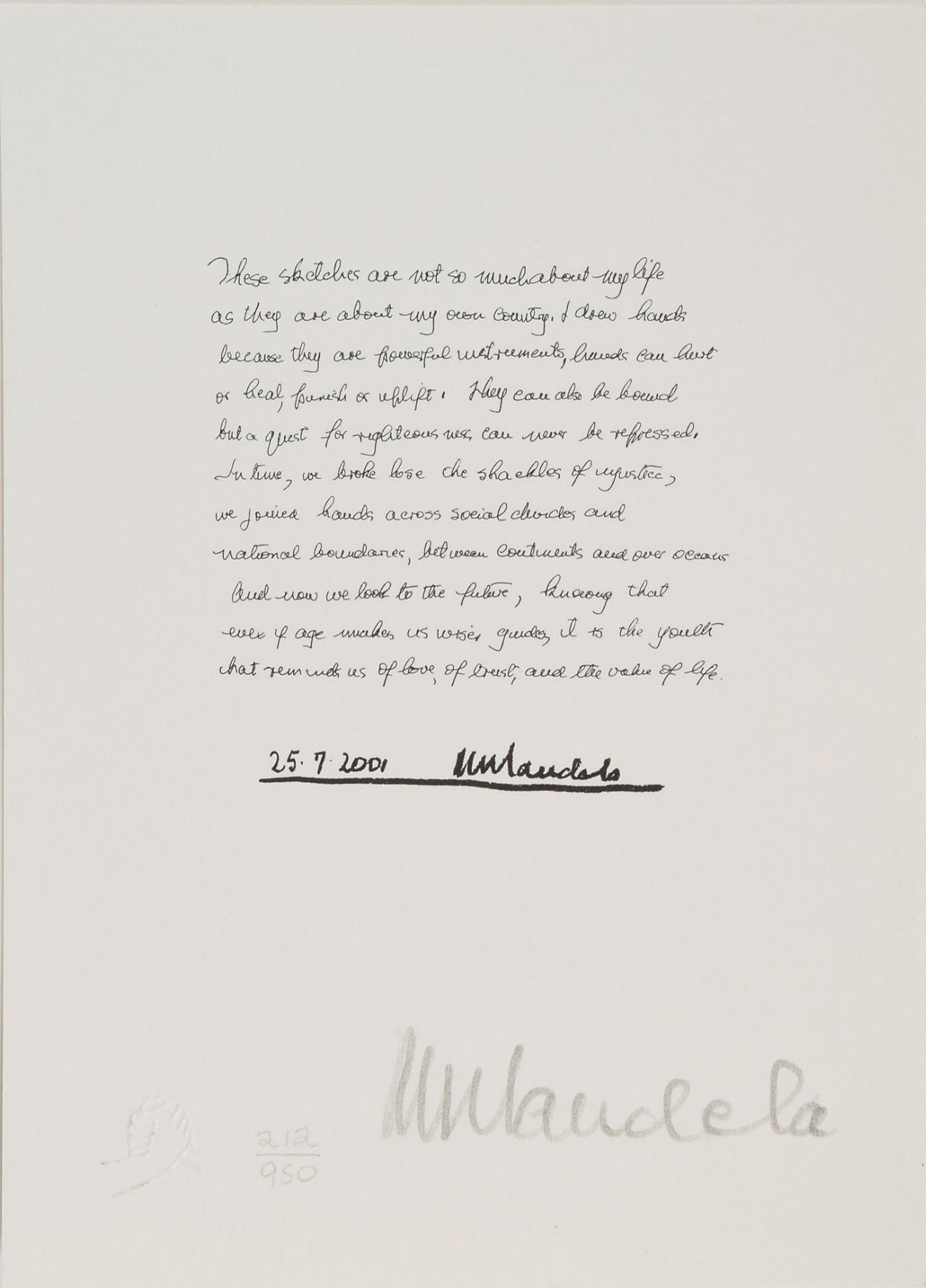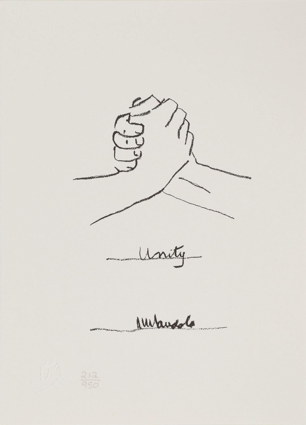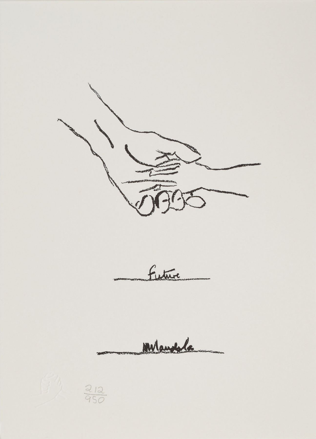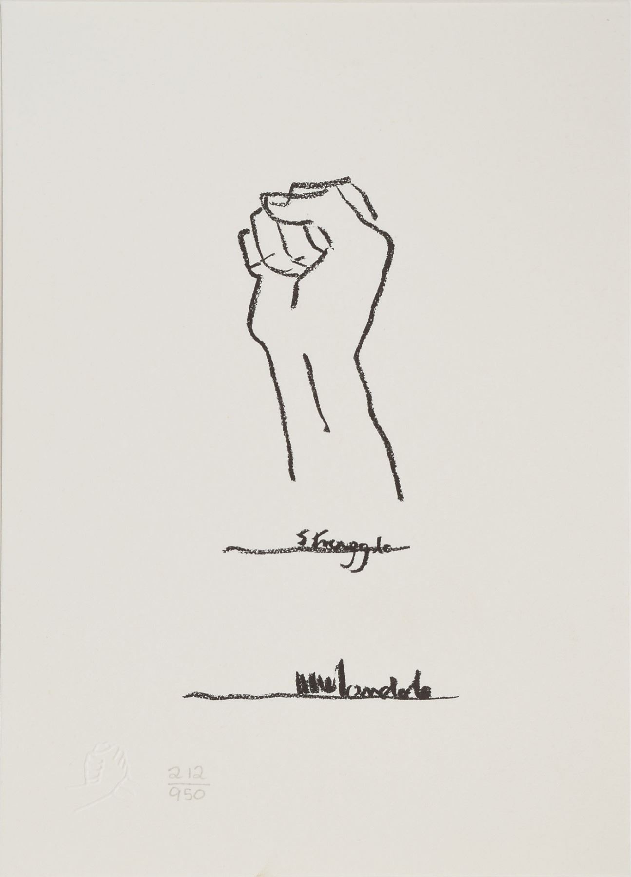 Beautiful limited edition set of six small-format lithographs entitled ‘The Struggle Series,’ numbered 212/950, each measuring 5.75 x 8.25, signed on the first lithograph in pencil, “N. Mandela.” The signed print reproduces Mandela’s handwritten description of the series, and the other prints are of sketches done by Mandela that chronicle his people's struggle; all six also feature Mandela’s facsimile signature inherent to the print. The sketches are entitled ‘Struggle,’ ‘Imprisonment,’ ‘Freedom,’ ‘Unity,’ and ‘Future.’ Mandela explains: ‘These sketches are not so much about my life as they are about my own country.’ In very fine condition. Accompanied by the publisher’s certificate of authenticity and the original handsome black embossed box. An absolutely stunning, scarce set signed by one of the great activist leaders of the 20th century.