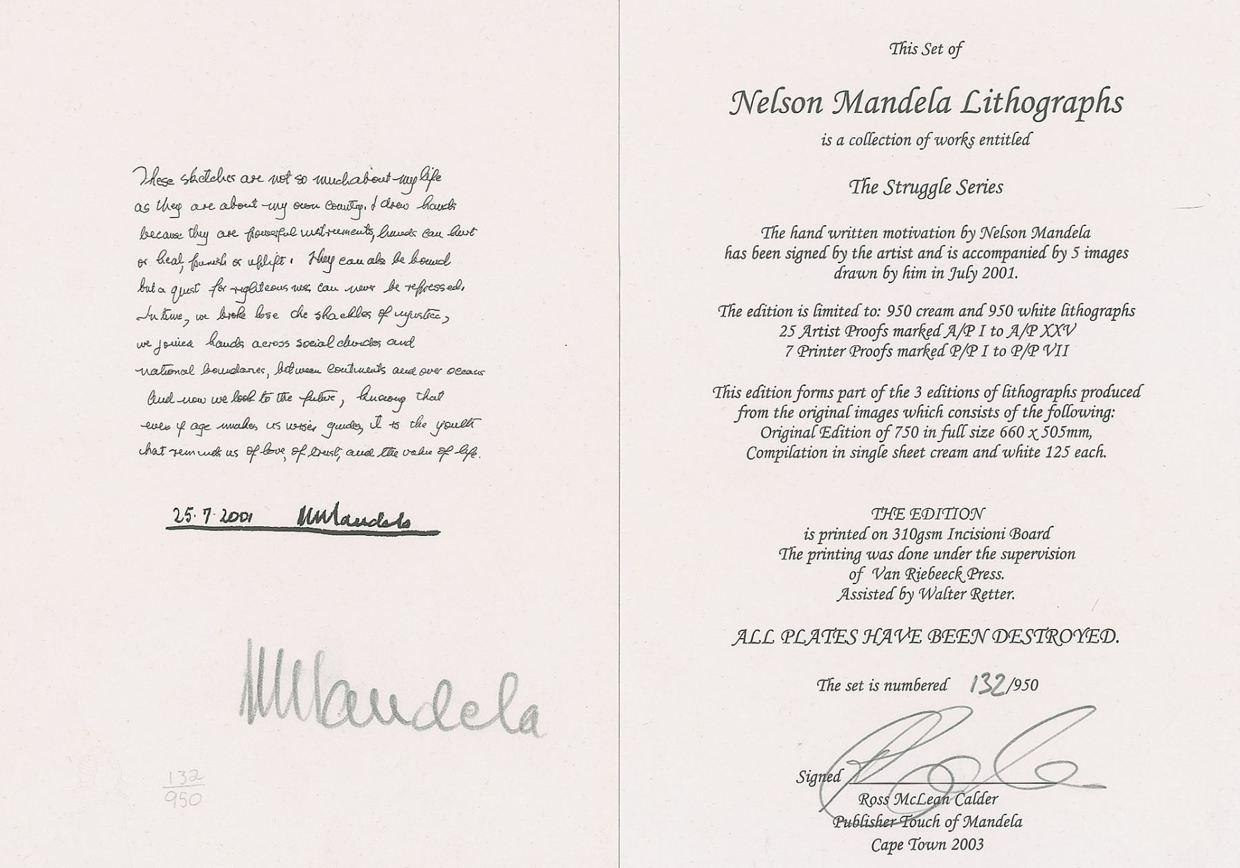 Beautiful limited edition set of six small-format lithographs entitled ‘The Struggle Series,’ numbered 132/950, each measuring 5.75 x 8.25, signed on the first lithograph in pencil, “N. Mandela.” The signed print reproduces Mandela’s handwritten description of the series, and the other prints are of sketches done by Mandela that chronicle his people's struggle; all six also feature Mandela’s facsimile signature inherent to the print. The sketches are entitled ‘Struggle,’ ‘Imprisonment,’ ‘Freedom,’ ‘Unity,’ and ‘Future.’ Mandela explains: ‘These sketches are not so much about my life as they are about my own country.’ In fine to very fine condition. Accompanied by the publisher’s certificate of authenticity and the original handsome black embossed box. An absolutely stunning, scarce set signed by one of the great activist leaders of the 20th century.