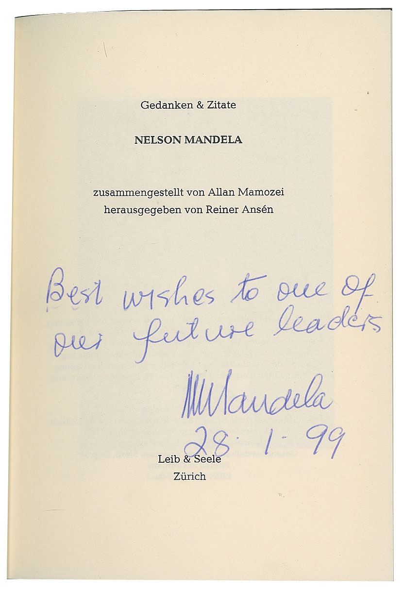 Signed book: Nelson Mandela: Gedanken & Zitate [Thoughts & Quotes]. Zurich: Leib & Seele, 1994. German-language hardcover, 5 x 7.25, 128 pages. Signed and inscribed on the title page in blue ballpoint, "Best wishes to one of our future leaders, N. Mandela, 28-1-99." In very fine condition.