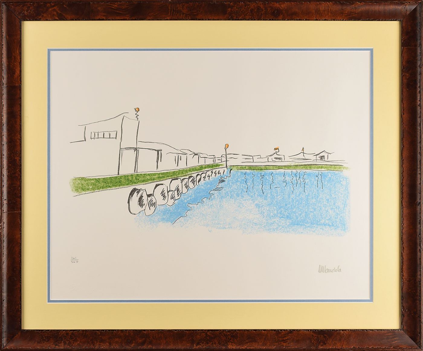 Limited edition color 24.5 x 19 lithograph entitled 'The Harbour' from Mandela's 'My Robben Island' suite, numbered 161/500, signed in the lower right in pencil, "N. Mandela." Handsomely double-matted and framed to an overall size of 32.25 x 26.75. In fine condition. This richly colored lithograph depicts the interment harbor where new prisoners would arrive. In Mandela's artist's motivation statement about the lithograph suite, he remarked: 'Today when I look at Robben Island I see it as a celebration of the struggle and a symbol of the finest qualities of the human spirit, rather than as a monument to the brutal tyranny and oppression of apartheid…In these sketches entitled: My Robben Island, I have attempted to colour the Island sketches in ways that reflect the positive light in which I view it. This is what I would like to share with people around the world and, hopefully, also project the idea that even the most fantastic dreams can be achieved if we are prepared to endure life's challenges.'