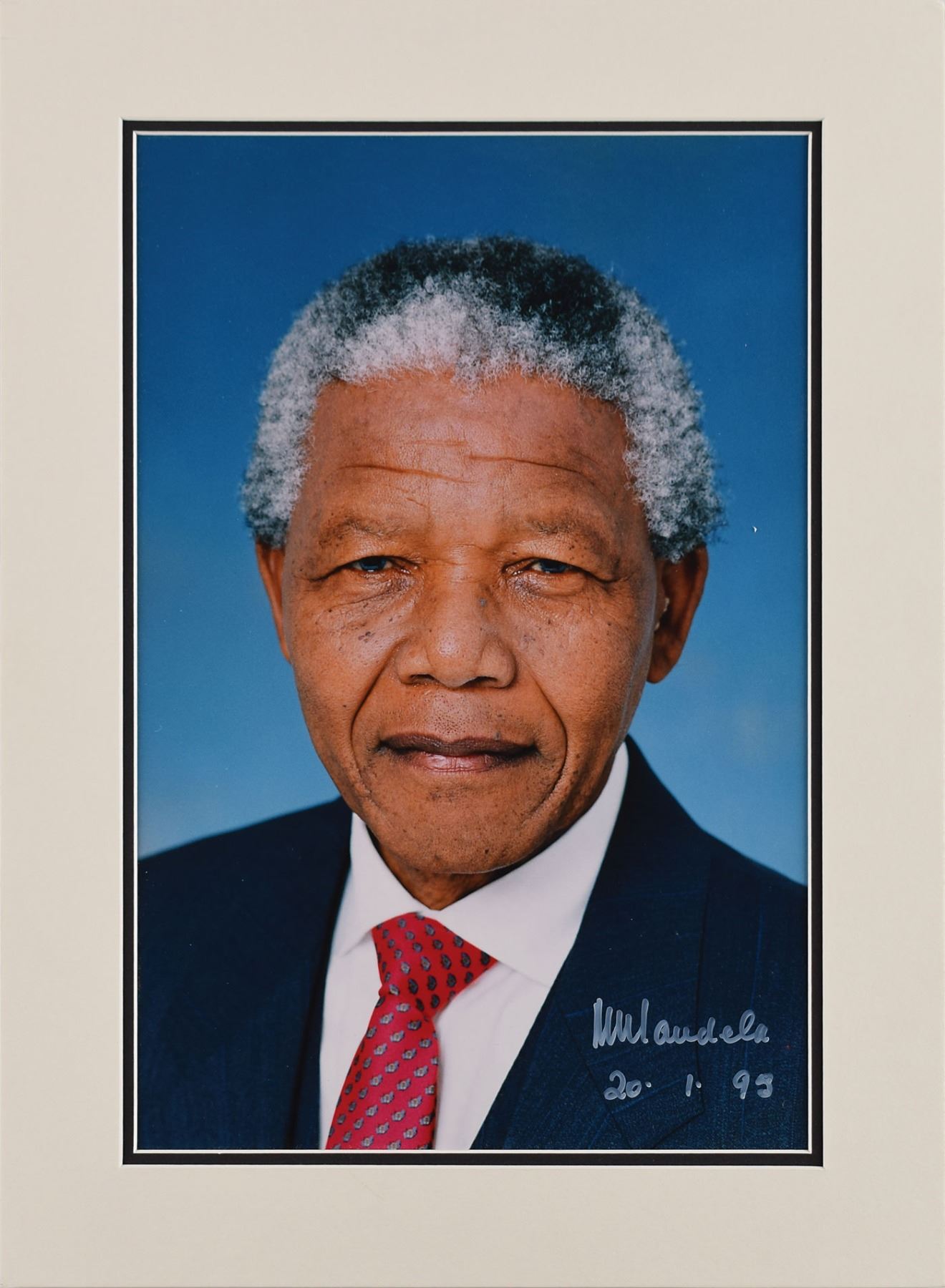 Magnificent color glossy 10 x 15 official portrait of the important South African president, neatly signed in white ink during his term in office, "N. Mandela, 20-1-95.” Double-matted to an overall size of 14 x 19. In fine condition.
