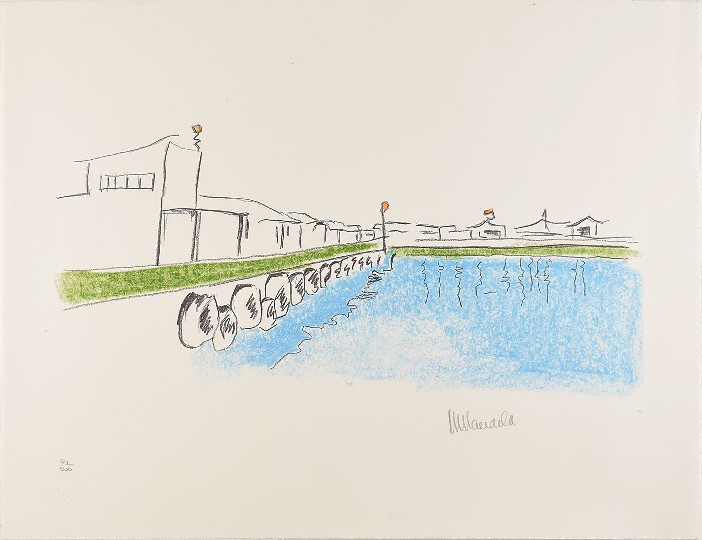 This richly colored lithograph depicts the interment harbor where new prisoners would arrive. In Mandela's artist's motivation statement about the lithograph suite, he remarked: 'Today when I look at Robben Island I see it as a celebration of the struggle and a symbol of the finest qualities of the human spirit, rather than as a monument to the brutal tyranny and oppression of apartheid…In these sketches entitled: My Robben Island, I have attempted to colour the Island sketches in ways that reflect the positive light in which I view it. This is what I would like to share with people around the world and, hopefully, also project the idea that even the most fantastic dreams can be achieved if we are prepared to endure life's challenges.'