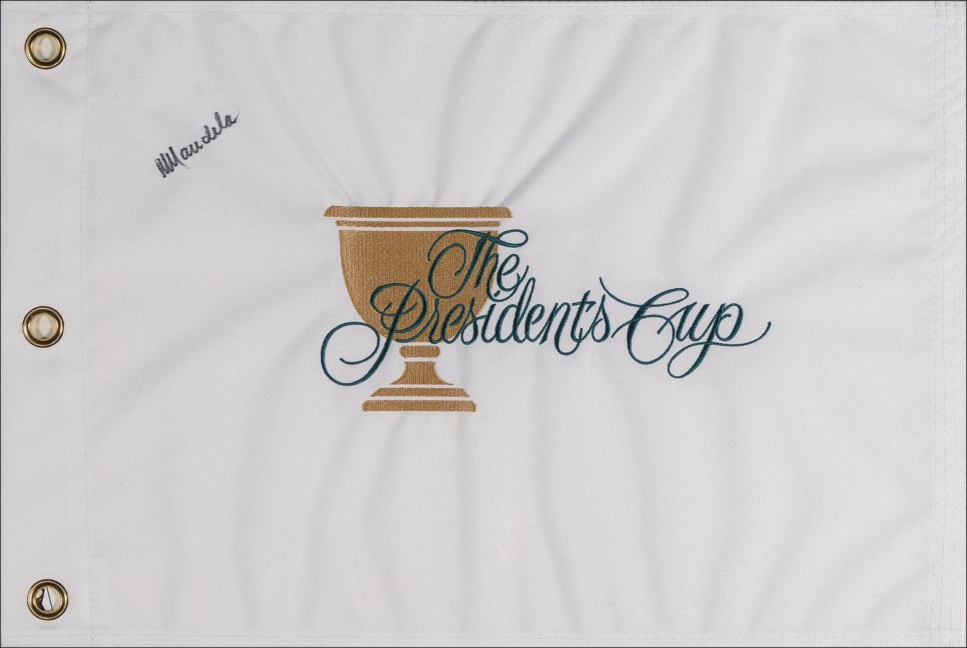 Bright white 2003 President’s Cup golf flag signed in black felt tip on the front. In fine condition, with a bit of expected light feathering due to nature of material. The 2003 President’s Cup was held in Capetown, South Africa.