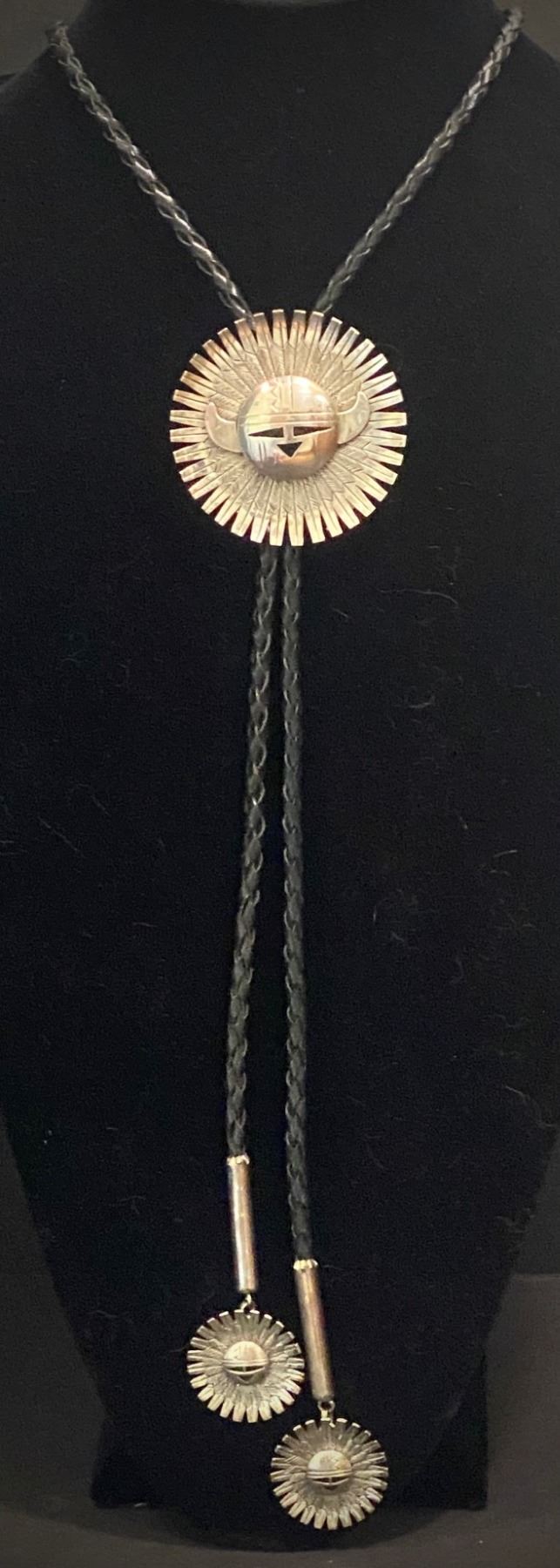 Nelson Morgan Navajo Artist Bolo with amazing silverwork 2 1/2" round Tips 1 1/4" round 21 inches from neck to tip ends 67 grams