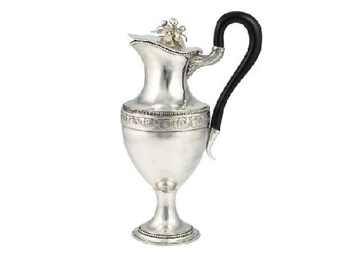 Silver, 466 g. Round, shaped base. Vase form body with foliated scroll frieze, beaded row which is repeating on the base and upper rim. Cover with leaf and bud form final. Elegant black handle with accantus leaf. Marked: Graz, circa 1790, Anton Streb. Reitzner: page 248. Size: 25.5 cm Dorotheum, Wien 28.05.2001 lot 63. Wiener Kunstauktionen 29-30.09.1995, lots: 932 and 936.