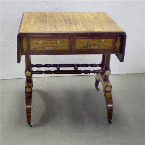 Neo Classical black walnut veneer table with mahogany cross banding on top; with drop leaves; over two short drawers; diamond inlay; double baluster carved stretcher; gilt wood medallions; curved square tapered legs ending in brass feet and casters; mid 20th C.; 29 1/4" high x 27 1/2" across x 21 3/4" deep; chip in cross banding where leaf meets table; pen indentation on table top; some veneer loss on legs