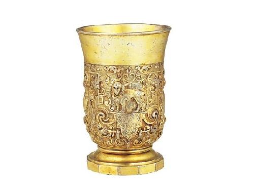 Silver with vermeil, 323 g. base with twelve sides, round at the upper part. Biedermeier form jacketed body. On the surface there is masterly chiselled renaissance foliage and ribbon decoration, lion and owl on lambrequins bases symbolising strength and wisdom. On two sides there are engraved gothic letters S and L . in shield form nameplates. Plain rim. Marked: Velence, circa 1830, on the base I. P. F. VEN. , (unsolved maker’s mark), animal in a circle, (unsolved guild stamp). Rosenberg: 7329 – mark used in the kingdom of Lombardia-Velece (1810-1872) Size: 13 cm