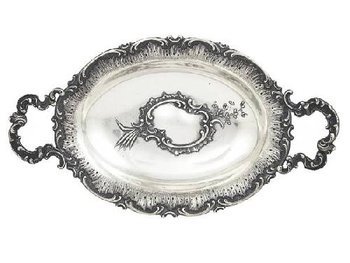 Silver, 436 g. Raised on four cast feet, oval bowl, pressed border decoration. Marked: Vienna, circa 1880, Gedlicka & Söhne. Neuwirth: I/203. Size: 40 x 22 cm