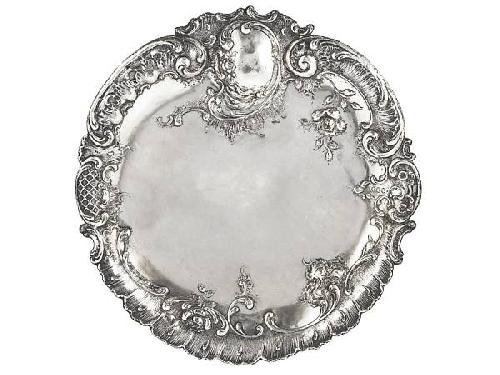 Silver, 1662 g. Big ornamental bowl, pressed and chiselled neo-rococo decorations. Marked: Vienna, circa 1880, Samuel Klepner. Neuwirth: I/295. Diameter: 54 cm