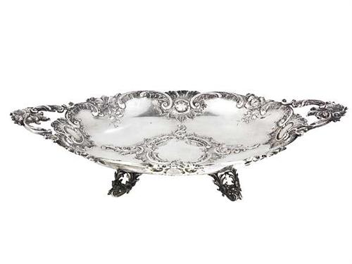 Silver, 666 g. Oval bowl raised on supports, cast handles. Marked: Austrian, circa 1880, Eduard Friedmann. Neuwirth: I/194. Size: 41.5 x 25.5 x 8.5 cm