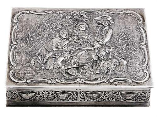 Silver, 504 g. Courting scene on the cover. Marked: Hungarian, 20th century, PV maker’s mark. Size: 13.5 x 9.5 x 3.5 cm