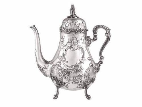 Silver, 785 g. Pear form body raised on four feet, plastic cover decoration, cast handle with bone rings. Marked: Austrian, circa 1880, Franz Rumwolf. Neuwirth: II/167. Size: 24 cm
