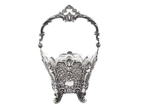 Silver, 134 g. Original blown and cut glass lining (slightly chipped). Raised on four supports, pierced basket and handle with pressed neo-rococo decoration. Marked: Austrian, late 19th century, Victor Nuber. Neuwirth: II/87. Size: 18.5 cm