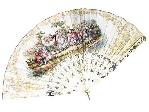Colour painted and gilt lithography on bone handle. On the fan there are little Cupids and rococo courting scene. German, late 19th century. Size: 27 cm