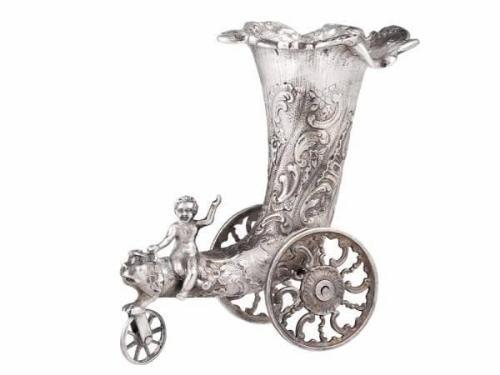 Silver, 128 g. Rolling stylised horn of plenty, with lion head and putti. German, Late 19th century, Austrian import mark. Size: 10 cm