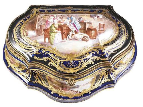 Porcelain faience, with gilt brass mounting. Dark blue ground, gilt fields with landscapes, on the cover there is a miniature genre picture. French, circa 1860 Size: 27 x 19 x 12 cm