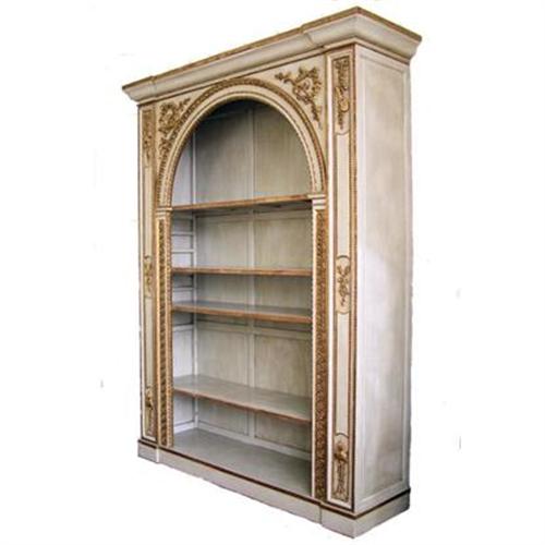 </font></strong>This impressive bookcase in Italian 18th century neoclassical style was custom-made approximately five years ago for $14,000. Measures 87" tall, 61.5" wide and 19.5" deep. Adjustable five shelves measure 14.25" deep. This bookcase features wonderful raised, carved decoration along the front, including torch and arrow motifs, oil lamps, cassolettes or atheniennes, lyres, ribbons and garlands, plus repeating egg and dart and guilloches around the perimeter. Condition is excellent. Color is a warm, neutral grey with faux gold leaf on all carved decoration. Available for shipment or pickup in Greenwich CT.