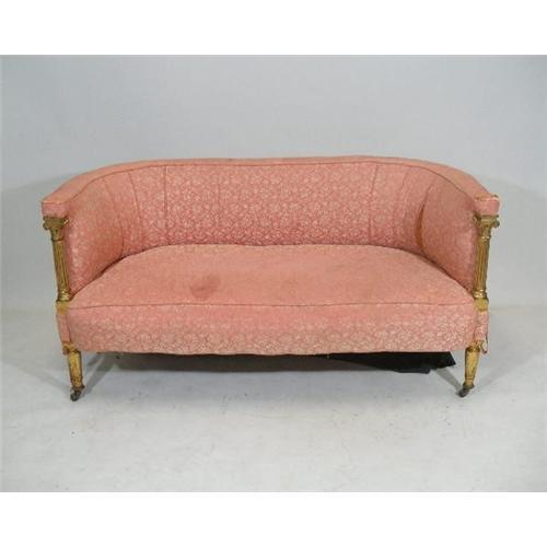 BEAUTIFUL!  Neoclassical English Settee, c.1830, Curved top rail form short arms.  Gilded and carved arm supports in the form of fluted Corinthian columns.  Upholstered body rests on turned and tapered gilded legs with casters.  Expected wear to gilding, upholstery "as is" condition.  30"h x 58"w x 30"d