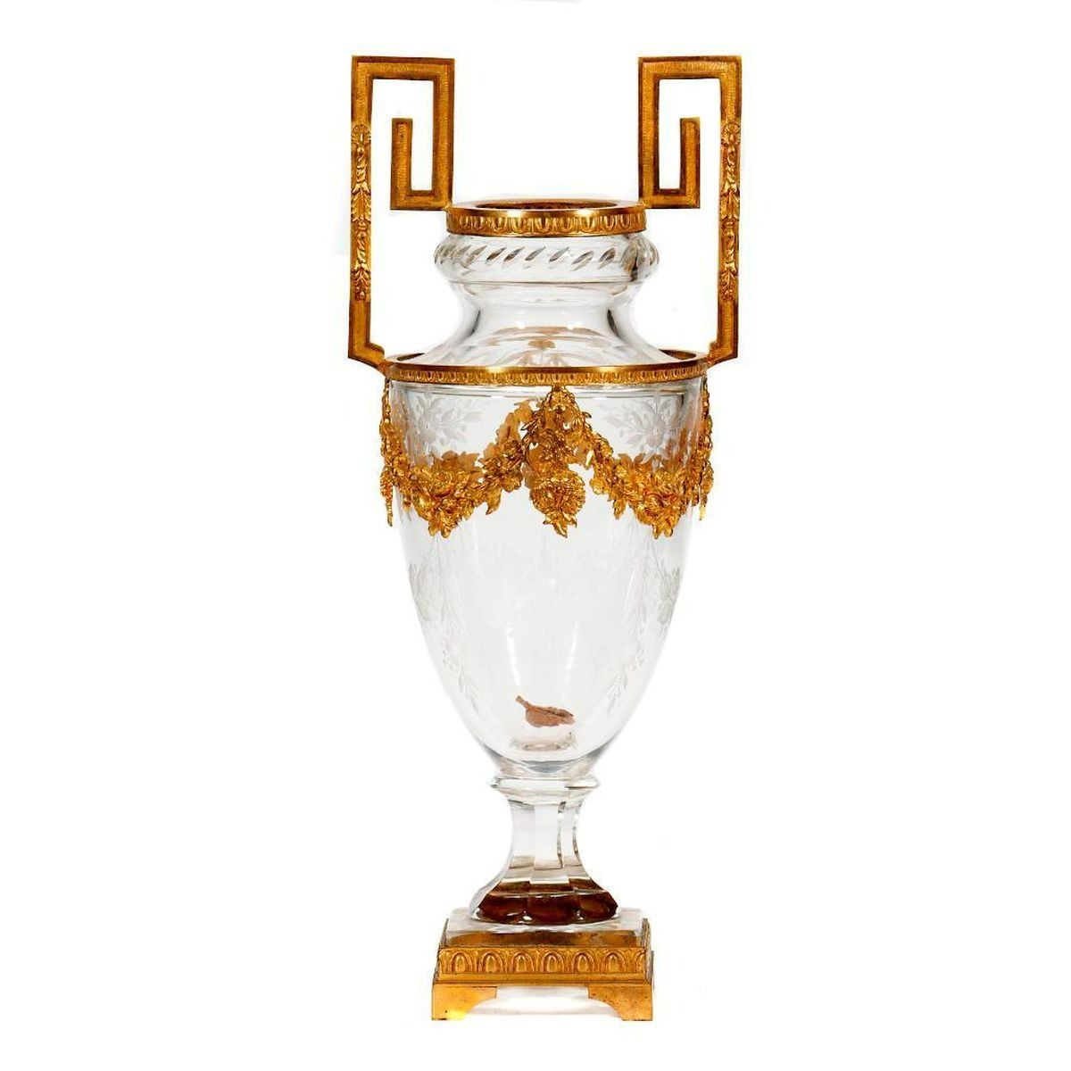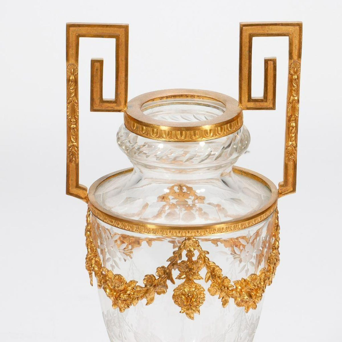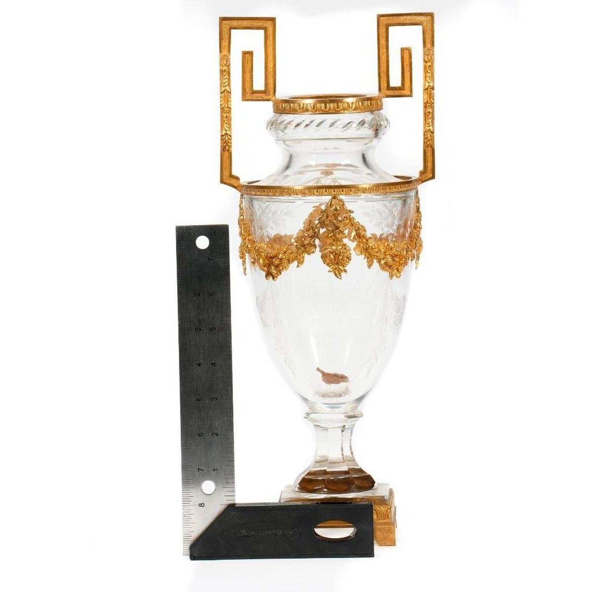 The floral-etched and cut crystal urn vase with Greek key-shaped handles. 15 1/4in. h. x 6 1/4in. w. x 5 1/2in. diam. Condition: Good; no chips or cracks.