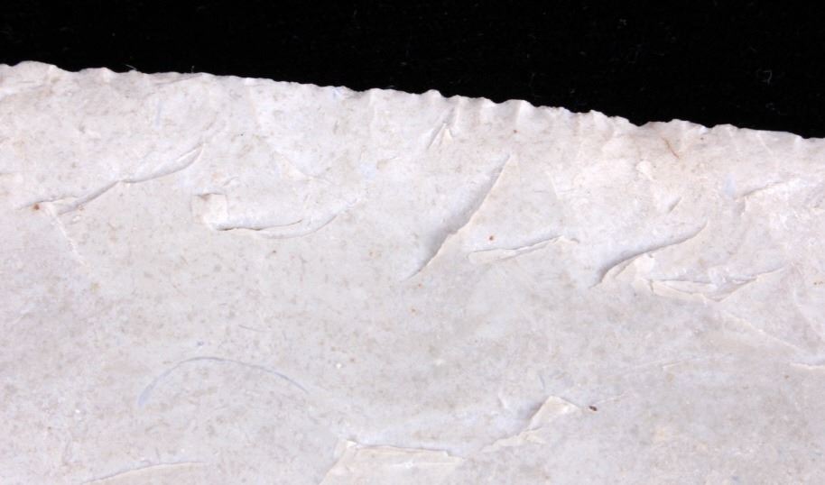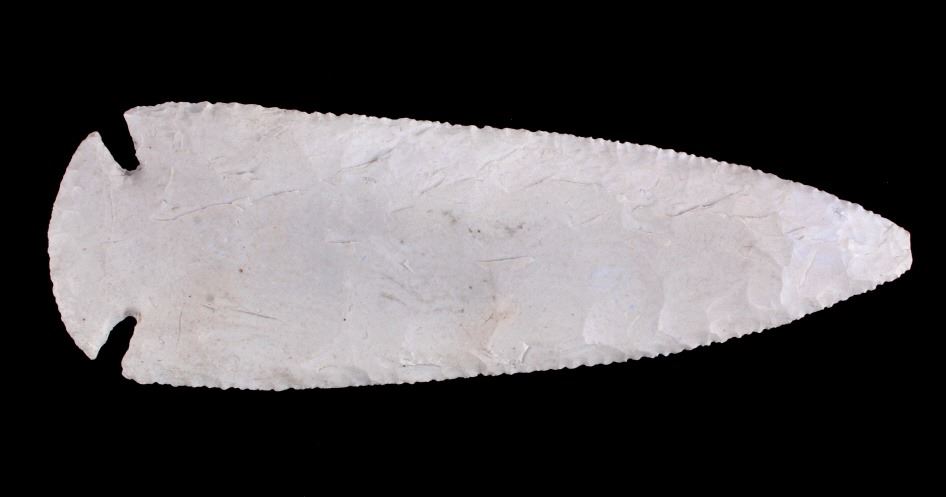 This is a Neolithic Age Plains Native American Indian spear point. This is a fantastic early Native American piece showing a hand knapped surface with notches for attaching to the shaft of a spear. The spear point shows good overall condition. It measures 2.5" wide and 7.75" long.