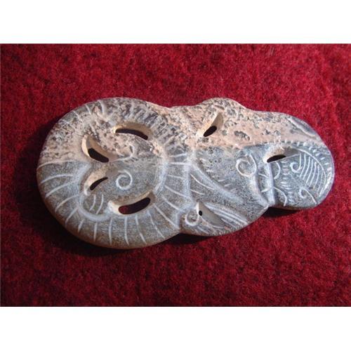 Neolithic period jade carving in shape of 2 facing dragons. The green jade is partially fossilizd, but the carving is intact and excellent. Dimensions: 2.9" x 1.5" (7.5 cm. x 4 cm.). Excellent condition. No damages. Provenance: Dr. Veleanu's jade collection, the author of the collector's textbook: "Jade, 5000 BC to 1912 AD, Guide to collectors" and the owner of Objets d'Art Uniques Internet store.