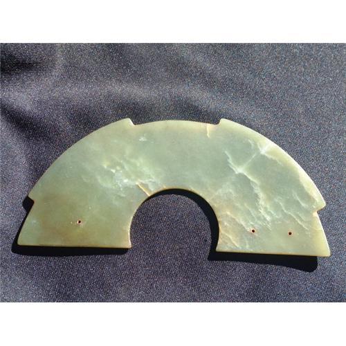 Long Shan Neolithic period jade large gorget in shape of half disk with peculiar 3 upper perforations drilled in typical Neolithic fashion. High quality of translucent nephrite with a few lighter green inclusions. Size: 7.8" X 3.5" (19.5 X 9 cm.). Estimated value: $7000.