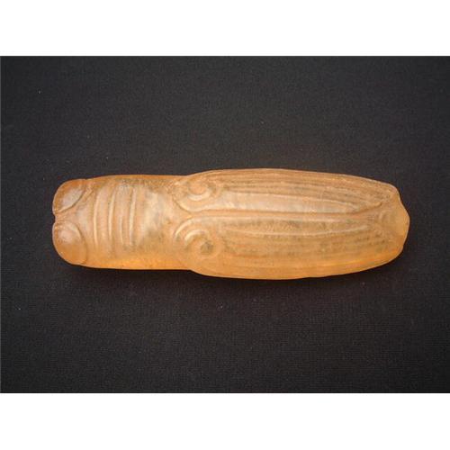 Archaic Chinese rock crystal carving dating to Hong Shan neolithic culture. While the neolithic jade carvings are relatively abundant on the collectors' market, the rock crystal carvings are extremely rare and not found even at world major museums. This is an authentic neolithic carving similar in carving to the jade statues of Hong Shan culture in Northern China. It represents a rather gigantic cicada. As there are no records of the customs of this period, we assume that this large statue was used as a veneration idol, possible a reincarnation and immortality symbol god. The natural rock crystal is remarkable clear of any inclusions and despite 6000 plus years has no damages other than an area of opacity and slight erosion on the distal end probably due to prolonged soil burial. Superficial micro-erosion is seen only with a magnifying glass. The rock crystal is transparent and has a honey-like hue. Provenance: Dr. Veleanu's collection, the author of the collectors' textbook: "Jade, 5000 BC to 1912 AD, Guide to collectors" and the owner of Objets d'Art Uniques Internet store. Estimated value: $10.000.