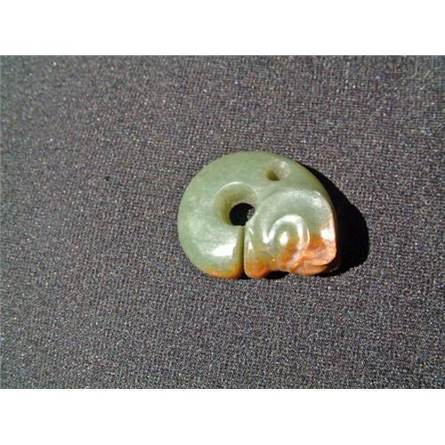 Neolitic period, Hong Shan culture green jade carving in shape of a coiled dragon. The Hong Shan nephrite jade carvings are very rare and most of the authentic Hong Shan carvings are made from hardstone bowenite, rather than nephrite. This type of dragon is called zhu-long, or pig-dragon, due to its appearance. The coiled dragon is in an incomplete round disk with a slit between the head and the tail. Auctions in China of Hong Shan nephrite jade carvings reached phenomenal prices due to its rarity. The perforations are typical bi-conical, drilled from both sides, attesting to its authenticity. Size: 1.5" X 1.2" (4 X 3 cm.).