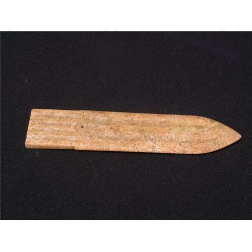 Neolithic period yellow-russet jade lance head probably used for ceremonial rituals. The central perforation (Hao) was drilled in a typical Neolithic fashion from both sides (see the book: "Jade, 5000 BC to 1912 AD, Guide to collectors". It dates to Neolithic period (circa 4000 BCE), Liang Zhu culture of coastal China regions. Rare!. Width: 1.8" (4.5 cm.). Length: 8" (20 cm.). Estimated value: $5.000. Provenance: Dr. Veleanu's collection, the renown author of collectors' textbook:" Jade, 5000, BC to 1912 AD, Guide to collectors".