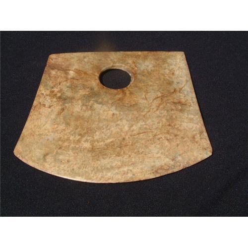 Neolithic period large jade axe probably used for ceremonial rituals. The central perforation (Hao) was drilled in a typical Neolithic fashion from both sides and has an uneven meeting point between the drillings (see the book: "Jade, 5000 BC to 1912 AD, Guide to collectors". It dates to Neolithic period (circa 4000 BCE), Liang Zhu culture of coastal China regions. Rare!. Width: 10" (25.5 cm.). Length: 9.5" (24 cm.). Hao diameter: 4" (10 cm.). Estimated value: $20.000. Provenance: Dr. Veleanu's collection, the renown author of collectors' textbook:" Jade, 5000, BC to 1912 AD, Guide to collectors".