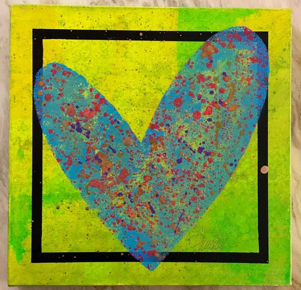 Neon Lime Green Heart by Del Mar, Paulina. Original One-of-a-Kind Hand Signed Acrylic on Canvas Stretched. Dimensions: 12 x 12. Excellent Condition.