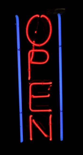 Available for your bidding pleasure we have a neon "Open" Sign used for advertising. The sign is lit in a vibrant blue along the edge and the lettering is lit in a neon red color. The background to this sign is black. The item has been tested and it is in good working condition. It measures 24" X 11".