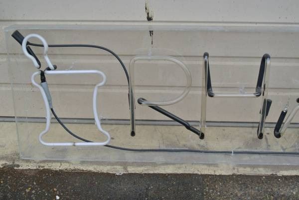 The neon is intact and unbroken, but the unit has no power supply. In a plexiglass frame measuring approx. 88 x 16 x 3.5 inches. NO SHIPPING.