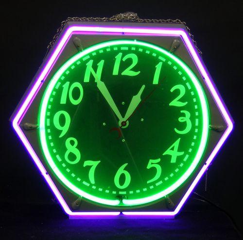 Neon clock 6 sided has green and lavendar neon works well 22"x20"high