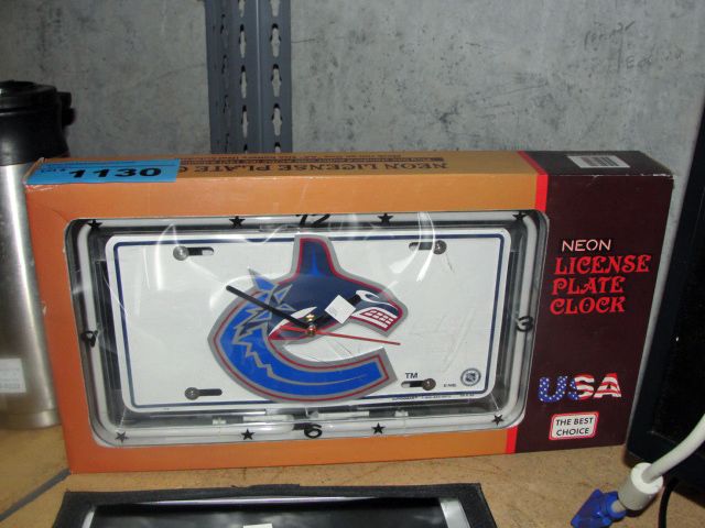 Neon license plate clock with vancouver canucks emblem