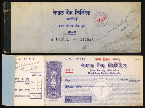 Katmandu, Nepal, 1960's, Partially used check book with 13 attractive unused checks, blue on white.