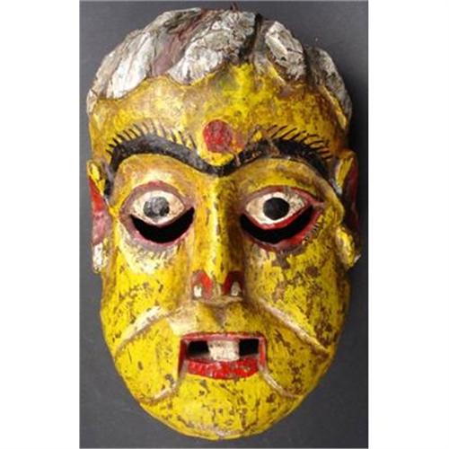 This is a Guaranteed Authentic Antique 19th Century Nepalese Mask from the Terai Region of Nepal and, unlike the vast majority of masks on the internet, it is not of recent make and designed for the tourist trade. It is a Genuine Antique Nepalese Mask that was used in a traditional context. It has the old red Customs seal, indicating that it was collected early. Wood, paint, and metal. Very Good Condition. Height: 11" (28cm)