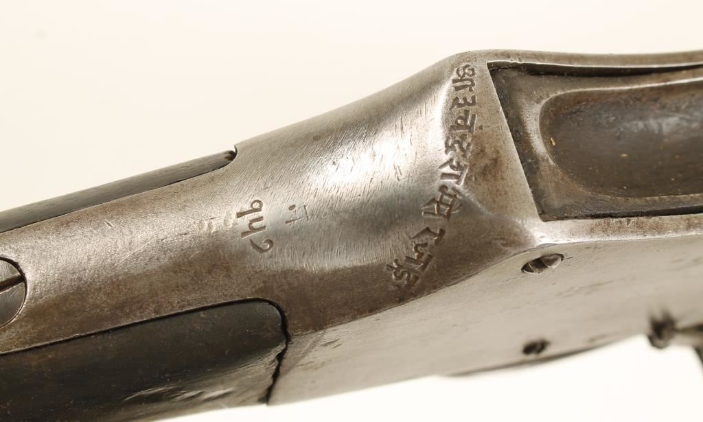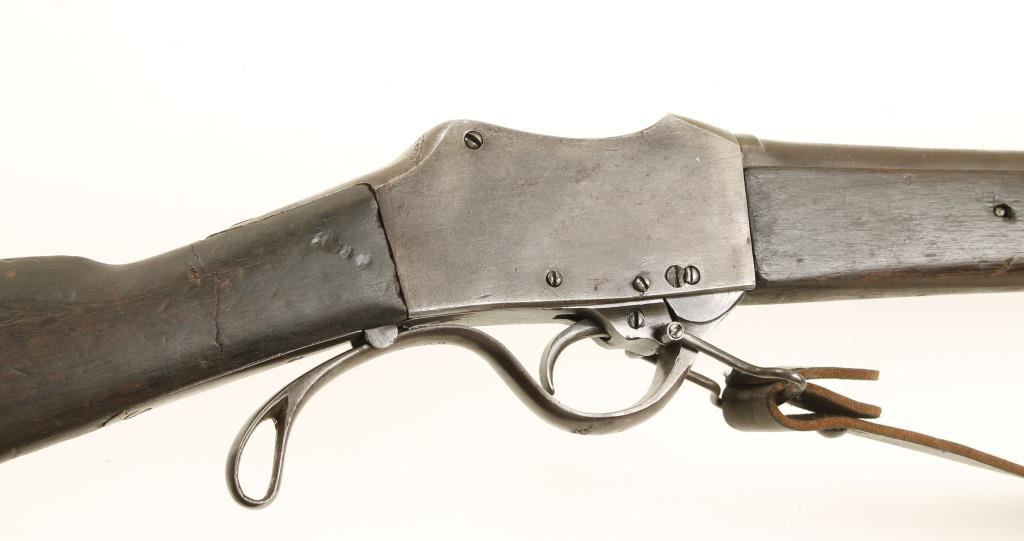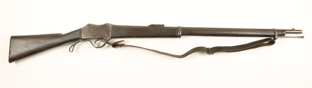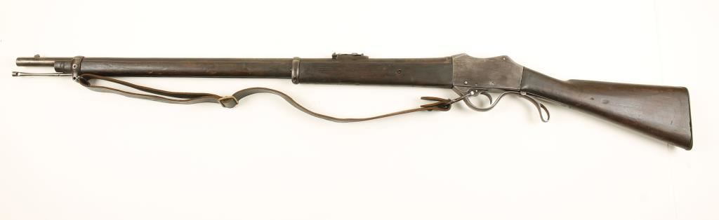Blued sloped breech single shot British military rifle with a 33.25" barrel and a leather sling. barrel is brown patina with surface rust and light pitting. Receive is faded with grey metal. Receiver and lever have Ghurka or Nepalese writing on them. Butt plate is brown rust patina broken into two pieces at the lower screw. Wood has many dings and scratches. Both butt and fore stock are a little loose. Bore is frosty with strong rifling. Action has to be cocked strongly to function. Condition is good as an antique. *Antique Firearm*