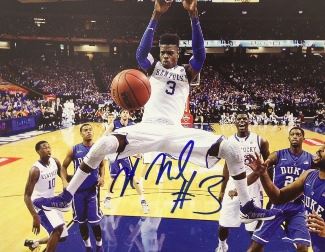 Nerlens Noel decided in April 2012 that he would be going to the University of Kentucky to play Division I basketball. On January 29, 2013, Noel set the UK single-game record with 12 blocks in a 87–74 team victory over #16 Ole Miss. The UK school record was previously 9 blocks in one game. Noel decided to declare for the 2013 draft on April 15, 2013. Nerlens Noel has also been honored with many awards in 2012-13 season including, SEC Freshman Of The Year, SEC Defensive Player Of The Year, SEC First Team, and SEC All Freshman Team. Nerlens Noel has hand signed this Kentucky Wildcats 8x10 Photo vs Duke. Private Signing in Louisville KY on April 21st, 2013. CBH Hologram and Certificate of Authenticity from Athlon Sports.