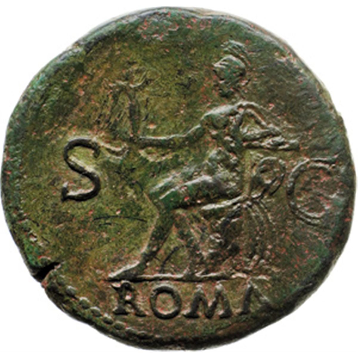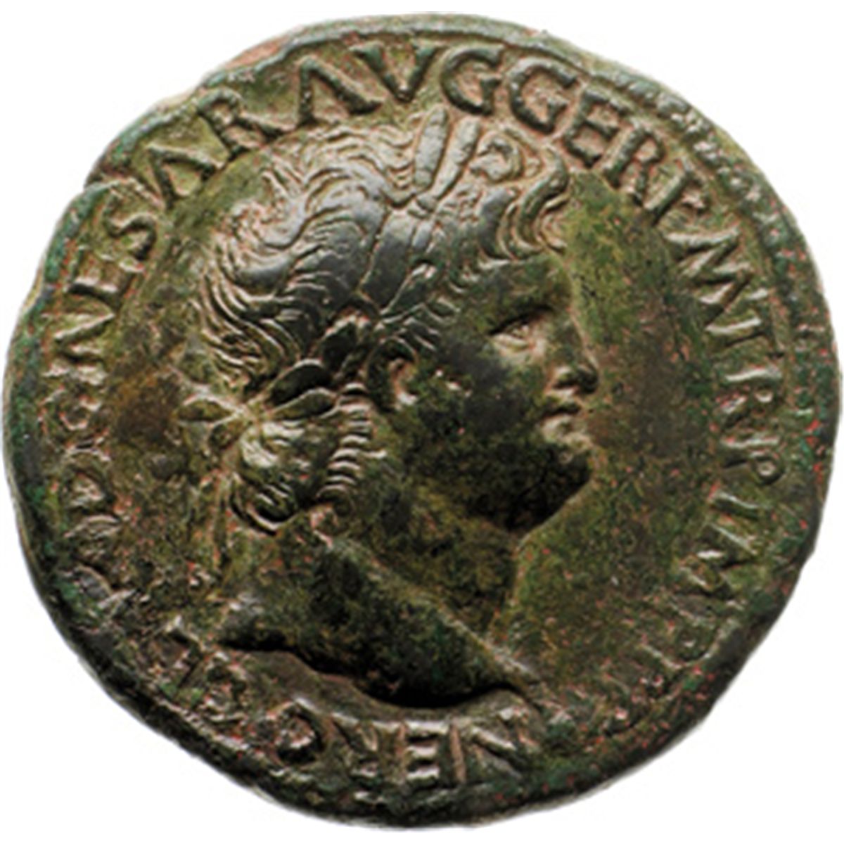 Impero Romano. Nerone (54-68). Sesterzio, Lugdunum. D/ NERO CLAVD CAESAR AVG GER PM TR P IMP PP. Testa laureata a destra. R/ ROMA SC. Roma, seduta a sinistra su corazza, tiene Vittoria sulla mano destra protesa e parazonium. RIC 398. AE. g. 24.23 mm. 35.00 Bel BB+. Patina smalto verde.