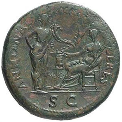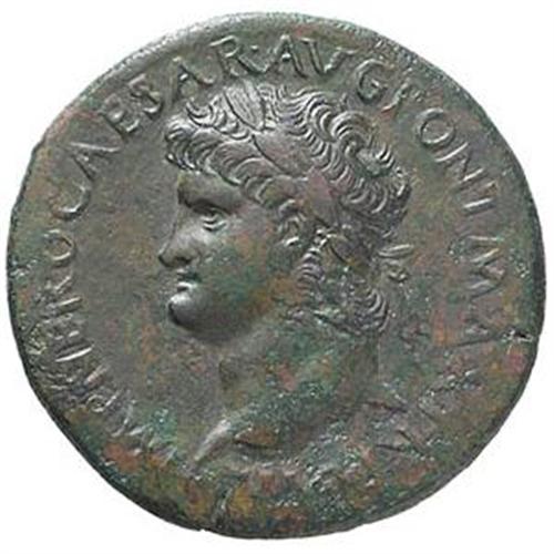 Impero Romano. Nerone (54-68). Sesterzio, Lugdunum. D/ IMP NERO CAESAR AVG PONT MAX TR POT PP. Testa laureata a sinistra. R/ ANNONA AVGVSTI CERES SC. Ceres velata, seduta a sinistra, tiene spighe e torcia. Di fronte a lei, Annona, stante a destra, tiene cornucopia. Al centro, modio su altare. RIC 495. gr. 25.47 AE. Bel BB+. Patina verde.