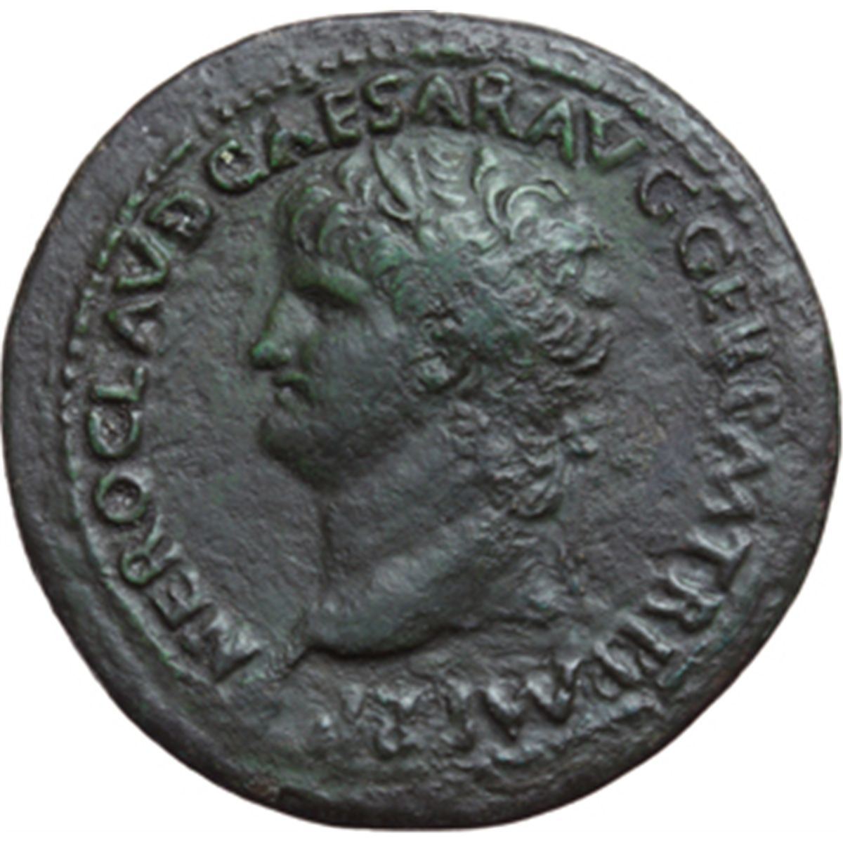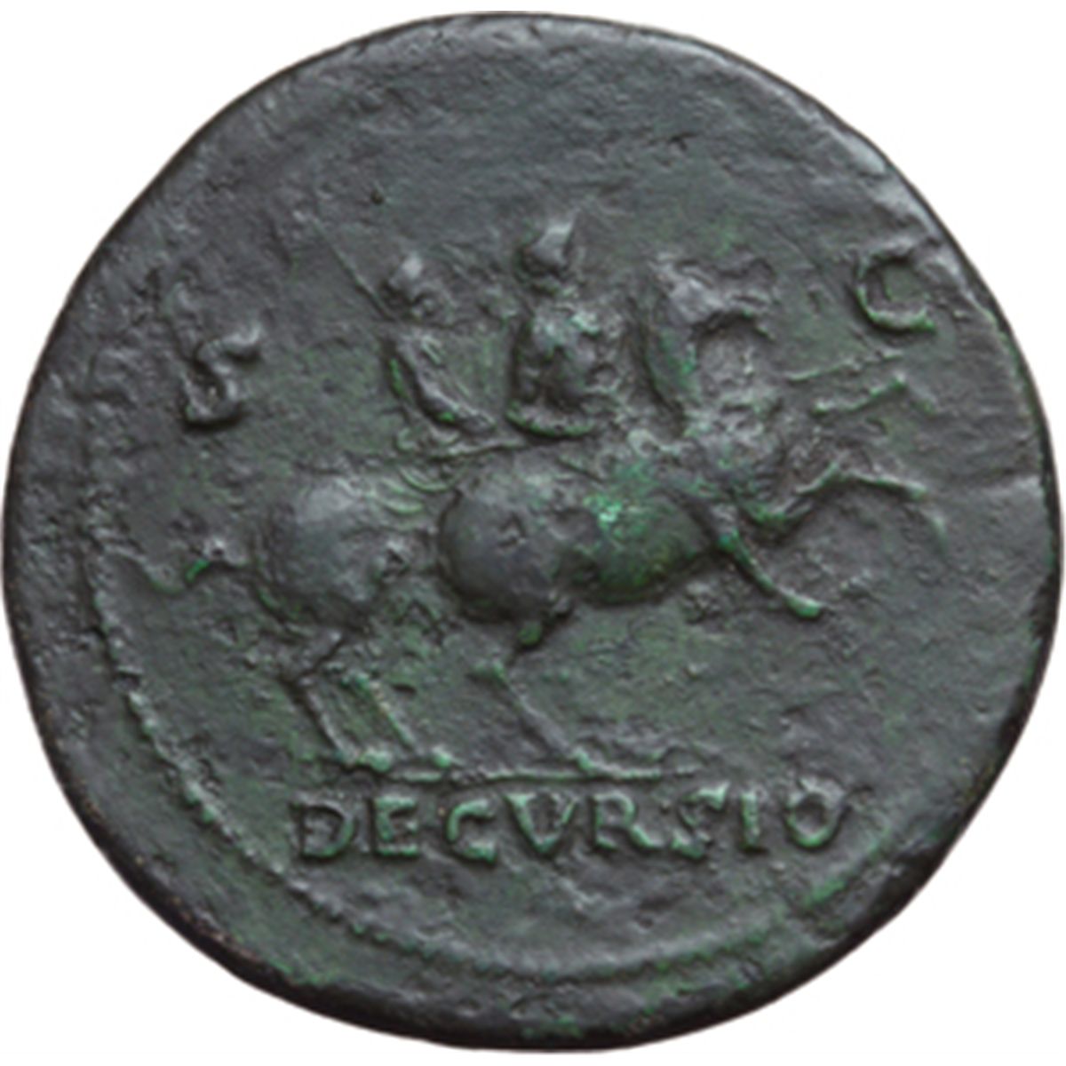 Impero Romano. Nerone (54-68). Sesterzio. D/ NERO CLAVD CAESAR AVG GER PM TR P P (sic) MP PP. Testa laureata a sinistra. R/ SC. Nerone a testa nuda, con corazza, su cavallo impennato a destra. Dietro di lui, in secondo piano, un cavaliere con vessillo. In esergo: DECVRSIO. RIC 168. AE. g. 28.56 mm. 35.00 R. BB. Singolare errore nella legenda (PMP per IMP). Patina verde.