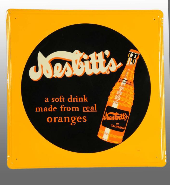 NOS Square tin sign with embossed circle and the famous bottle. Colorful orange and perfect. Condition (9.5). Size 28" x 28".