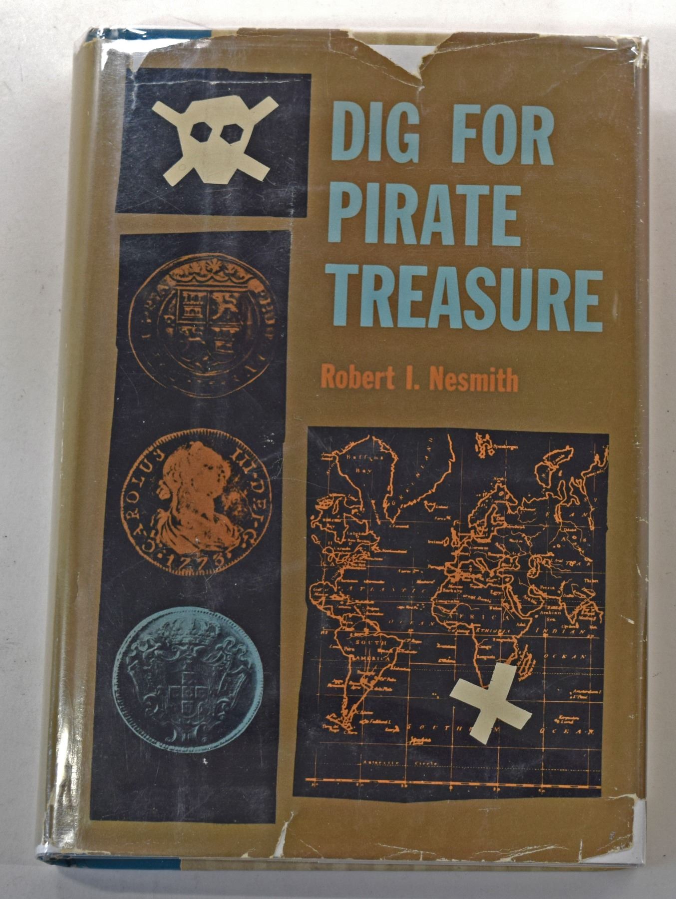 Nesmith, Robert I. (Signed) DIG FOR PIRATE TREASURE. The Devin-Adair Company. 1959. 12mo, 302 pages; Hardcover w/ DJ; Signed by the author; Approximately half of this book concerns sunken treasure, contrary to its title (which suggests buried treasure). The book includes the story of William Phips and the 'Concepcion', the 'Lutine', the 'Hussar', the Vigo Bay galleons, and several references to Art McKee, the 1715 Fleet and 1733 Fleet. The author was the owner of Foul Anchor Archives, a Rye, New York bookstore dedicated to treasure hunting books, and a noted scholar on Spanish American cobs. Subject: History - Sunken Treasure